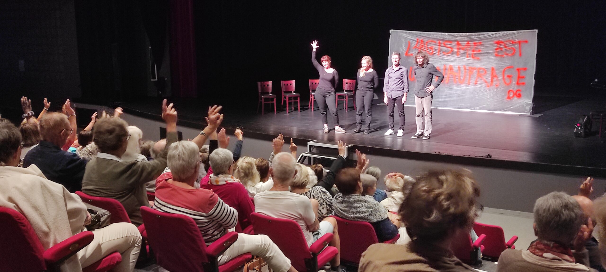 109 personnes ont pu profiter du talent de la troupe de théâtre qui a joué trois scénettes mettant en avant la thématique de l’âgisme. Le public a ensuite pu interagir et partager son vécu ce qui a permis à la Compagnie Amadeus Rocket d’interpréter ces moments de vie en direct et ainsi de mettre en lumière leur talent d’improvisation.